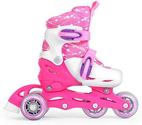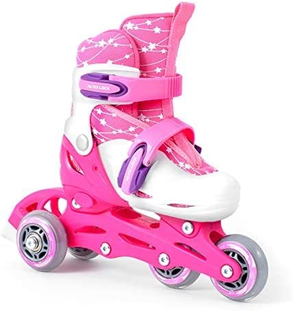 • WEITERE EIGENSCHAFTEN - Skelett aus Kunststoff, atmungsaktiver Schuh, Rollengröße: 64 mm, ideal für Kinder und Mädchen, Farbe: Weiß/Rosa, verstellbare Konstruktion, Bremse auf dem rechten Schuh, Lieferumfang: Kinderhelm, Schoner, 2in1 Rollerskates / Inlineskates, Rucksack, max. Belastung: 60 kg