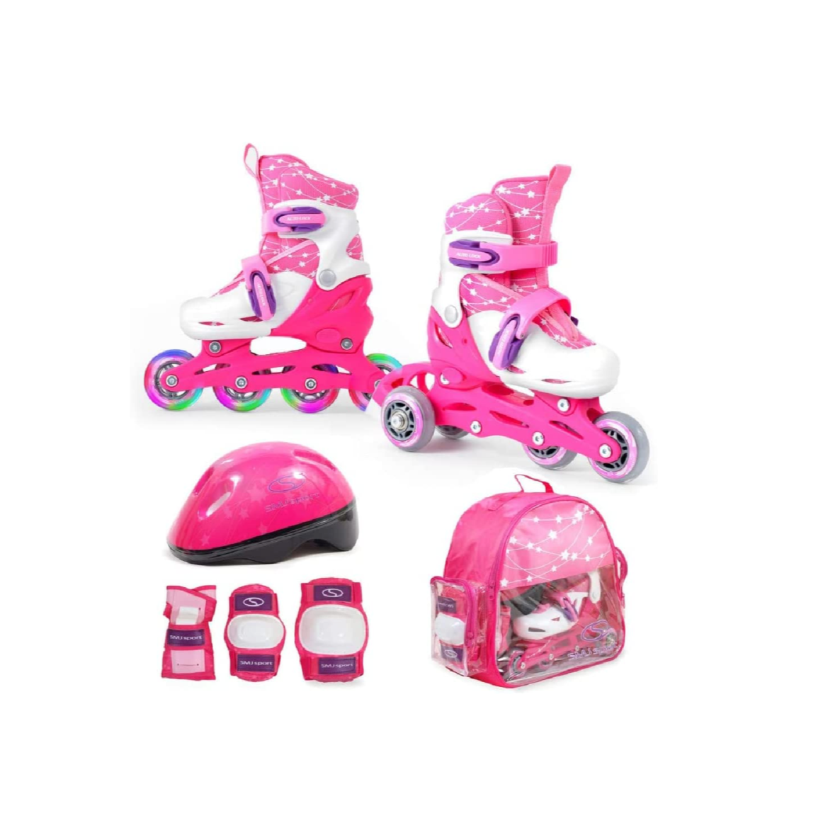 • SKATING SET - das Combo Set von SMJ Sport beinhaltet alles um das Abenteuer mit dem Skating zu beginnen. Das Set besteht aus einem paar größenverstellbarer 2in1 Skates (Inline- / Quadskates), Schutzausrüstung (Knieschoner, Ellbogenschoner und Handgelenkschoner), ein größenverstellbarer Sturzhelm und eine praktische Tragetasche